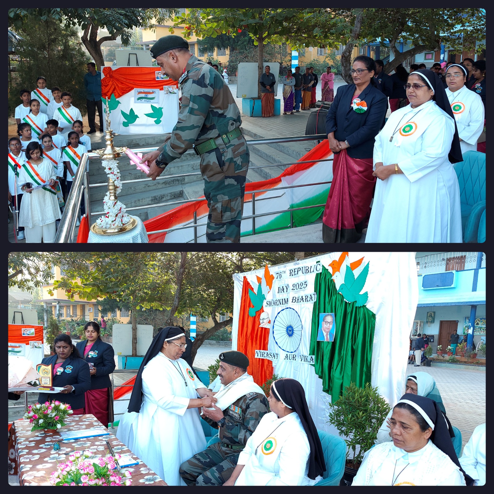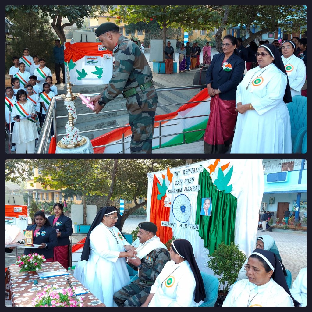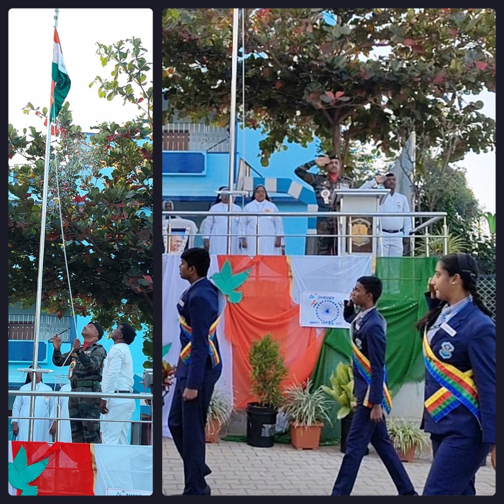 The republic day celebration was held on 26th January 2025 at sharp 7:30 am in our school premises. We invited our honourable chief guest Mr. Anil Crasta the Indian Army to our school for the Republic day celebration. Our dear sister. Leaders, teachers and our band students escorted him to host our tricolour flag. We had a wonderful programme held by the march past, lighting of the lamp, prayer service, welcome speech introduction of the chief guest our dear manager & principal honoured him with a shawl banquet, memento then followed by a skit, dance, drill by our dear students. The celebration was made special by our chief guest with his speech which inspired all of our students and teachers the celebration was a grand success. We distributed sweets to our children and we dispersed.